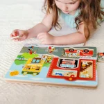- 8-piece wooden sound peg puzzle with realistic fire station and neighborhood sounds